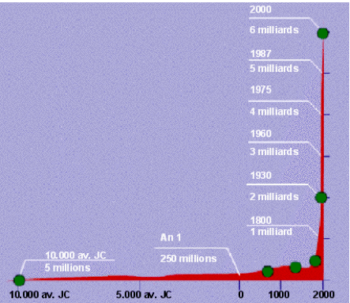 La capacité de charge de Sol3 est largement dépasséeFig. 1.A. L'effectif de population des primates dominantes (axe vertical) au cours du temps (axe horizontal - exprimé en nombre de révolutions de la planète autour de Sol ou années; le temps zéro est une valeur arbitraire d'origine religieuse).