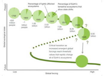 Fig. 2. Cette figure illustre la relation entre l'augmentation récente de la population des primates et le pourcentage des écosystèmes qui montrent une bascule, une sortie de l'équilibre précédent. Avec le chiffre attendu d'une population de 9 milliards, la publication souligne la vraisemblance d'une rupture globale de l'ensemble des écosystèmes, comme cela s'est déjà produit à cinq reprises par le passé. (Barnosky et al. 2012, Nature 486, 52)