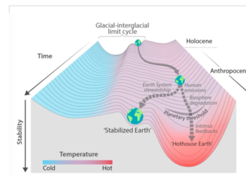 Fig. 3.Représentation paysagée du passage du système planétaire hors de l'Holocène, sorti du cycle glaciaire-interglaciaire pour atteindre sa position actuelle dans l'Anthropocène. La bifurcation représente les deux chemins possibles pour le futur (flèches en pointillés). Pour le moment le système planétaire est sur le chemin “serre chaude”(hothouse earth), du fait des émissions de gaz à effet de serre et de la dégradation de la biosphère. L'autre chemin possible mènerait à une stabilisation artificielle : un état quasistable maintenu par l'action de l'humanité. Les systèmes qui sont parvenus à un état très stable (fond de vallée) ont une énergie potentielle faible, il faut donc une énergie considérable pour les en sortir. Les sytèmes restés sur le haut de la colline ont une forte énergie potentielle et il suffit d'une petite addition d'énergie pour les faire dégringoler dans le fond de la vallée. (Steffen et al. 2018. Proc. Natl Acad. Sci. 115, 8252)