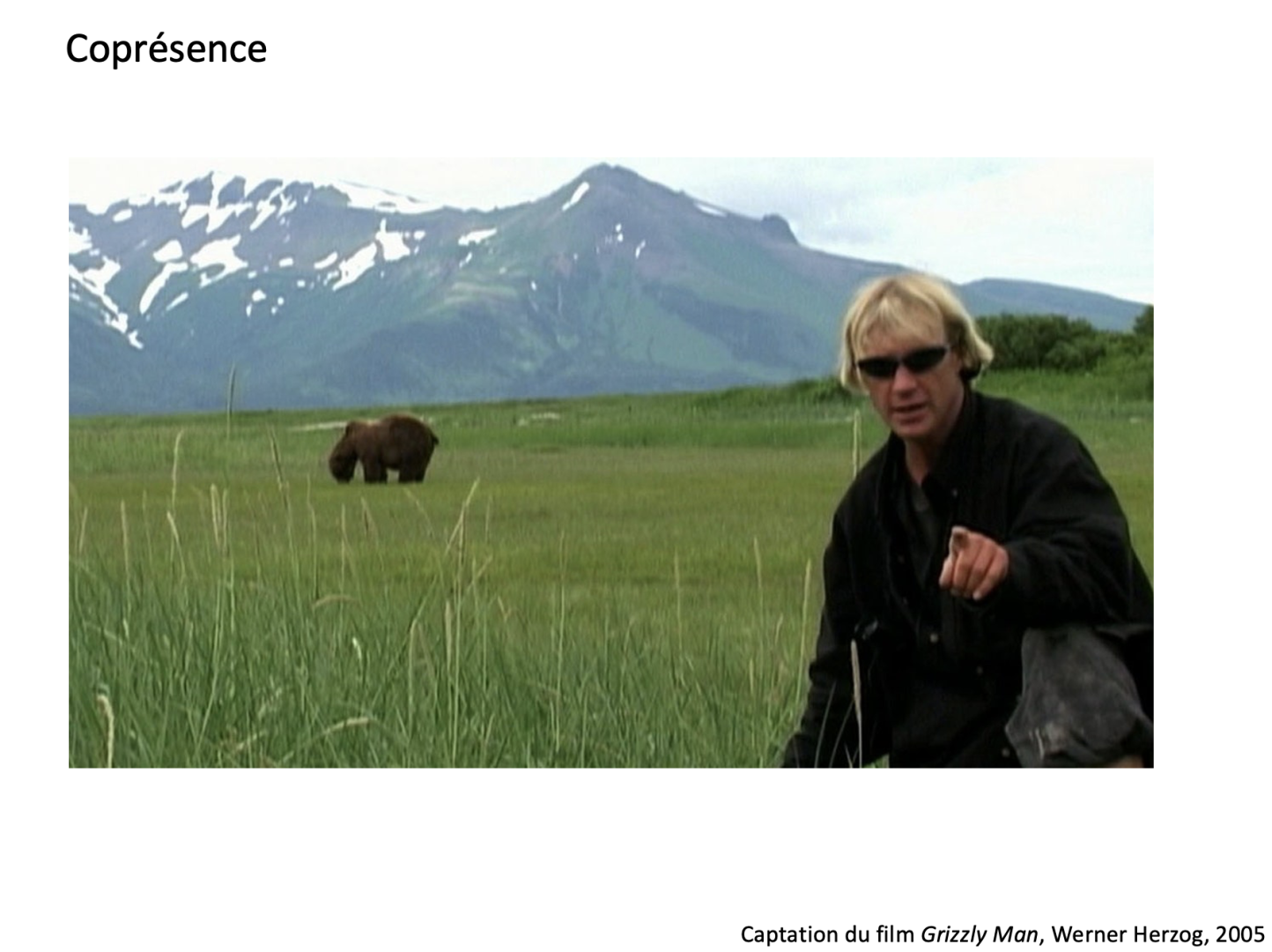 La coprésence évoque le documentaire de Werner Herzog, Grizzly Man (2005). L’écologiste américain Timothy Treadwell s’était filmé au milieu des grizzlys en Alaska sans armes pendant treize ans, en co-présence. La 13ème année, il se réinstalle en Alaska pendant l’été et il et il est dévoré avec sa compagne. Herzog a été subjugué par ce misanthrope à la fois individuel et communicationnel. Cela me semble être un exemple de cette idée que nous partageons avec tous les autres, un monde dans lequel nous avons une proximité forte avec tout type de personne humaine et tout type de vivant. C’est la thèse de Baptiste Morizot : il faut entrer en discussion avec les loups pour développer une diplomatie de la coprésence.