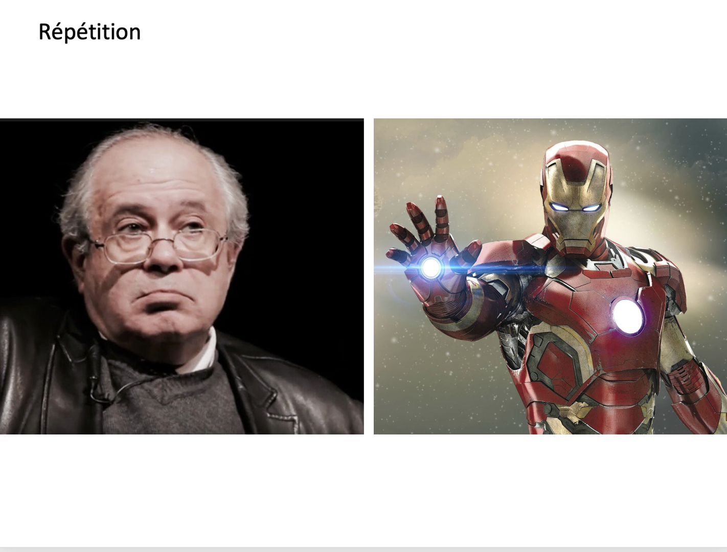 Dernier point : à gauche, l’ancien président de l’École de la cause freudienne, Jacques-Alain Miller, à droite Iron Man, de la société Marvel. Ce que je voudrais aborder ici, c’est cette idée de répétition, l’idée que l’on voit apparaître de plus en plus des fonctionnements répétitifs à la fois dans une élite intellectuelle de type lacanien (on est le gendre de Lacan, on répète de génération en génération) ou dans une version populaire entertainement à Hollywood, il y a une répétition de père en fils, une reproduction qui devient légitime, quelque chose qui n’a plus vocation à progresser d’un point de vue artistique, grâce à une franchise (Marvel).