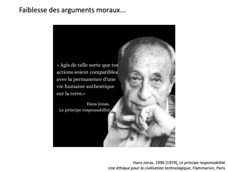 Deuxième possibilité, se baser sur des arguments éthiques : arrêter la course au progrès. Je cite ici Hans Jonas et son principe responsabilité : « Agis de telle sorte que tes actions soient compatibles avec la permanence d’une vie humaine authentique sur la Terre ». C’est un exemple, parmi d’autres, comme les ontologies alternatives à la Philippe Descola, qui cherche des arguments pour convaincre éthiquement d’arrêter ce qu’on fait.