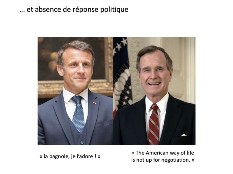 Face à ces arguments scientifiques et moraux, on voit bien que le politique est limité en termes de prise en compte de cette nécessité de transformer le mode de fonctionner. Bush : L’American Way of Life n’est pas négociable, Macron « La bagnole, je l’adore”.