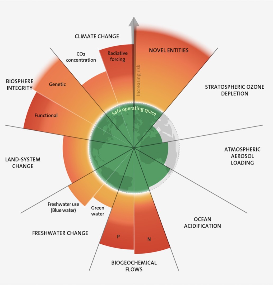 Ainsi était titré un colloque international organisé par des philosophes, à l’Université de Rennes, les 2, 3 et 4 octobre 2024. Agnès et Yves eurent l’occasion d’assister à quelques demi-journées de ce colloque et en rendent compte subjectivement ici. La base scientifique omniprésente était constituée de la liste des articles initialisée par : Johan Rockström and alii, « A Safe Operating Space for Humanity », Nature, 23 September 2009. Cet article inaugural, le plus cité depuis quinze ans dans la littérature du système-Terre, introduisait le cadre de pensée des « Planetary Boundaries » (les limites planétaires), remplaçant ainsi les anciennes « contraintes écologiques » du « développement durable ». En 2024, neuf limites planétaires ont été évaluées et six d’entre elles sont dépassées :