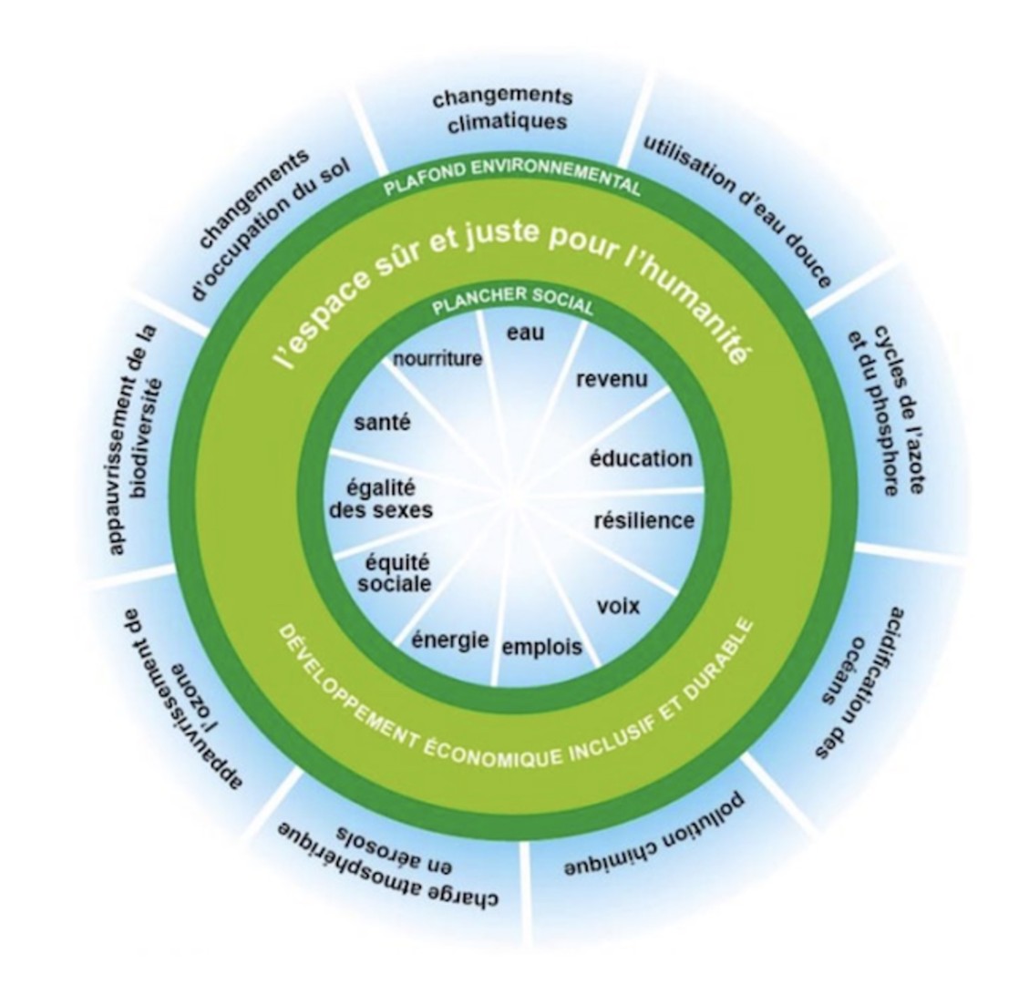 Le « Doughnut Model » (le modèle du beignet) : Entre le plafond environnemental et le plancher social, existe un espace sûr et juste pour l’humanité, tel est exposé par Kate Raworth le vieux rêve des militants : réconcilier l’économie et l’écologie. Bien sûr, on devra préciser de quelle économie il s’agit, de quel niveau de vie parle-t-on, pour qui, et quelle est la désirabilité de ce modèle du beignet. « Dans un monde dominé par le libéralisme, ce modèle pourrait sembler liberticide » affirme Lauriane Mouysset (CNRS/CIRED), qui évoque néanmoins la possibilité d’un « écolibéralisme ».