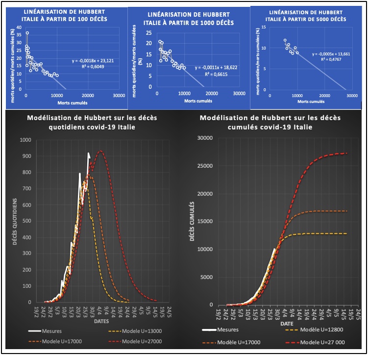 En Italie, le pic de mortalité de l’épidémie semble en passe d’être atteint. Les données italiennes sont plus fiables que les françaises car le nombre de décès est plus important et ce dernier détermine la fiabilité de la régression linéaire ci-dessus. À la fin de cette vague (fin avril), le nombre total de décès est estimé par cette méthode s’évalue entre 14 000 et 27 000. L’écart est grand car les chiffres tardent à diminuer conformément au modèle de Hubbert. Or proche du pic, chaque jour supplémentaire apporte un nombre important de décès.