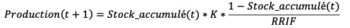 Où K correspond à l’ordonnée à l’origine de la régression linéaire du ratio Production(t) sur stock_accumulé(t)(ordonnée) sur le stock_accumulé (abscisse) ; RRIF correspond aux ressources récupérables in fine, c’est-à-dire le stock final. Il se retrouve à l’aide de la pente de la régression linéaire (RRIF=-K/pente).