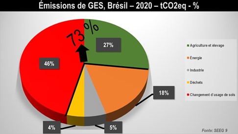 Sur la carte, il est possible de remarquer que le déboisement est le plus fort à l’est et au sud de l’Amazonie brésilienne. Le Brésil se classe désormais au 5e rang des pays émetteurs de gaz à effet de serre (après la Chine, les Etats-Unis, l’Inde et la Russie). Mise à part l’Indonésie, les émissions brésiliennes sont très atypiques. En effet, les émissions du secteur agricole sont de l’ordre de 73% du total du pays (changement d’usage des sols : 46% ; agriculture et élevage : 27%). À titre de comparaison, le secteur agricole mondial répond pour 30% des émissions de GES (20% agriculture et élevage ; 10% changement d’usage des solos). L’élevage émet quant à lui 14,5% des émissions mondiales.