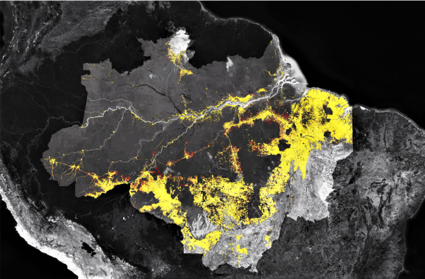 Le déboisement constitue la principale dégradation globale et régionale. Cela représente 800 000 km2 entre 1988 et 2020, soit une surface bien supérieure à la France. Environ 17% des forêts ont donc été converties à d’autres usages, et cela n’inclue pas la dégradation qualitative de certaines parcelles forestières. En 2021, nous déplorons la destruction de 13 000 km2 de forêts, et 8 000 km2 de Cerrado, cette savane sud-américaine.