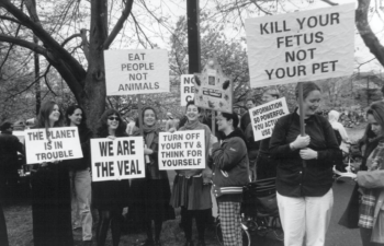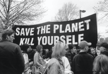 Totale antithèse des mouvements réactionnaires pro-vie, on peut citer l’église pleine de second degré Church of euthanasia, à traduire en français par l’église de l’euthanasie crée en 1992. Elle voit l’humain comme une espèce invasive dont il faudrait se débarrasser pour le bien de la planète et la préservation de l’environnement. Les slogans revendiqués dans différentes manifestations/happenings, également repris dans les textes de la révérend trans Chris Korda artiviste et DJ sont empreints d’une certaine misanthropie véhémente. Des injonctions au suicide telles que « Save the planet kill yourself » , on peut aussi relever « Human extinction while we still can », « Eat a queer foetus for Jesus », « Eight Billion Humans Can’t Be Wrong ». La Church of euthanasia démontre un intérêt pour la tragédie humaine en cours, l’idée de la disparition de notre civilisation, puis de notre espèce. L’égoïsme ambiant conduit à la condamnation des possibilités de vie de notre propre descendance. Cette église fictive est l’occasion de se questionner sur l’inaction des anciennes générations, et de la fuite de leurs responsabilités vis-à-vis de l’avenir de notre planète. Il s’agit de préparer nos excuses pour les générations futures et de constater que nous avons échoué à faire de la planète un monde encore vivable. Qui aimerait dire à ses enfants, « je le savais mais je n’ai rien fait » ? Personne, pourtant le panorama que l’on peut établir de la situation actuelle laisse penser qu’il s’agira bel et bien de s’excuser auprès des prochaines générations qui seront encore davantage touchées que les millenials. Dans la mélancolie du futur, il y a l’idée de l’impossibilité de devenir parent.