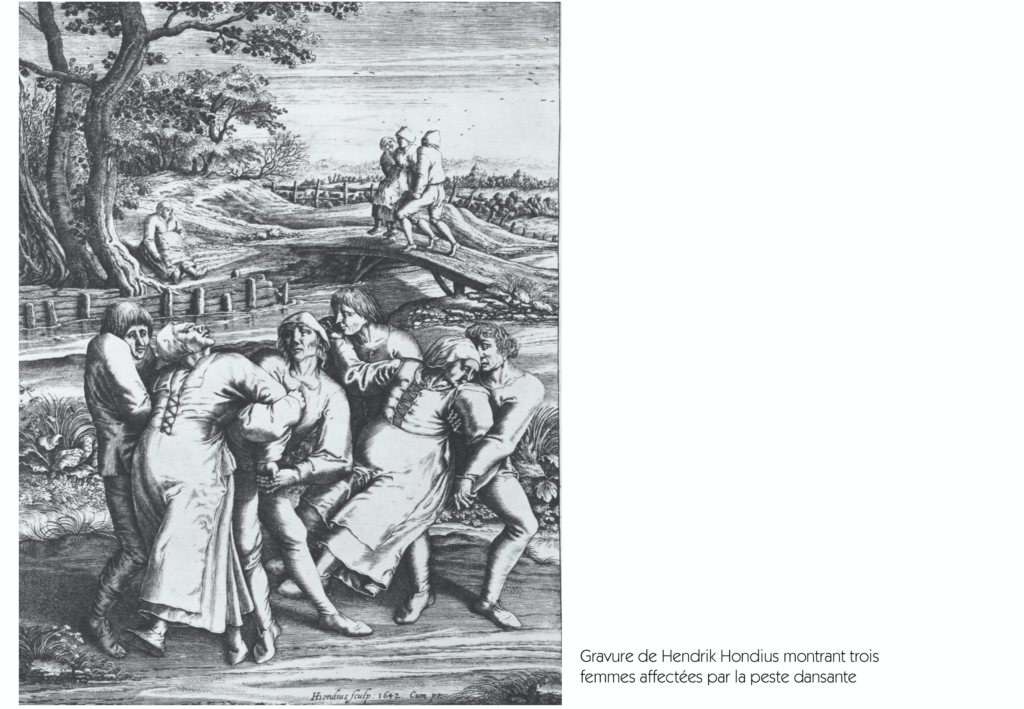 J’ai tendance à considérer l’épidémie dansante de 1518 comme la première rave-party du monde. Le 12 juillet 1518, des personnes désespérées, empoisonnées, se mettent à danser sans s’arrêter, sans pouvoir s’arrêter, comme possédées. En sueur, en transe, elles dansent jusqu’à la chute, jusqu’à la mort. Elles semblent prises d’une sorte de mal étrange et contagieux, c’est une danse qui finira par rassembler des milliers de personnes et durera plusieurs jours. C’était il y a plus de 500 ans.