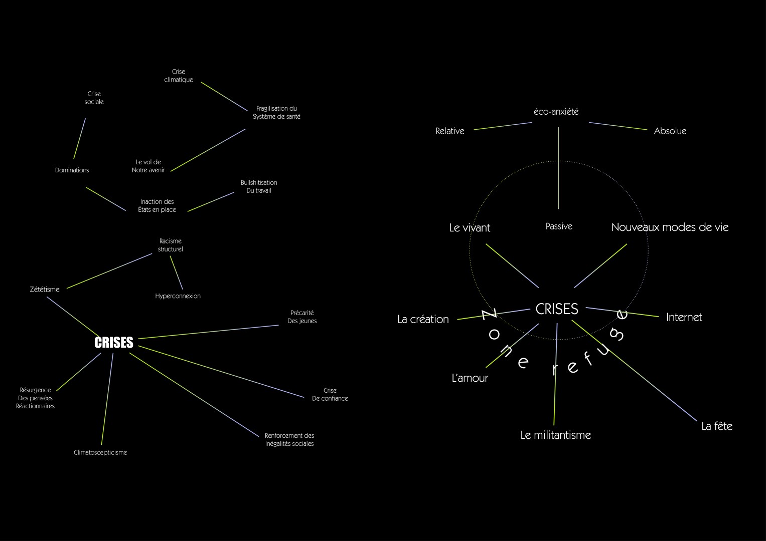 Cette époque, à la fois terrifiante mais tout autant fascinante, marquera peut-être une première. Les révolutions, souvent associées à des révoltes de jeunesse, permettront réellement de changer l'ordre établi si elles parviennent à se consolider. Il est temps de se réapproprier nos corps, de remettre du politique dans chacune de nos actions, il est temps de nous dire que nous ne sommes pas une anomalie, des marginaux du système, mais que nous sommes les créateur·ices, les testeur·ices du suivant. Chaque décision est un cas de conscience, chaque projet semble inatteignable. Acheter une maison (peut-être jamais), se marier (l’amour est trop « liquide »), avoir des gosses (engendrer des petit·es pollueurs·es). Il est globalement de plus en plus compliqué de se projeter, de savoir ce qu’il adviendra de nos vies tant les crises que nous traversons modifient le paysage, le décor. La crise sanitaire dont nous sortons tout récemment, du moins en Europe, n'est que le prélude à d'autres crises à venir, qu’elles soient sociales, politiques, économiques, psychologiques ou alimentaires. L’idée est de faire une sorte d’état des lieux. De dessiner une sorte de cartographie générationnelle en voyageant de thème en thème.
