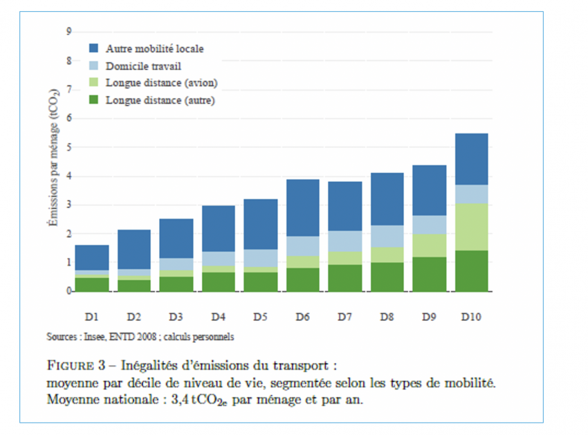 La Stratégie nationale bas carbone (SNBC) en France vise la neutralité carbone à l’horizon 2050. Le secteur des transports, responsable de 30% des émissions de CO2 en France doit être mis à contribution (20% des émissions de CO2 en France proviennent de la mobilité des personnes). C’est le seul secteur qui a vu augmenter ses émissions depuis 1990. Toutefois il est important de comprendre que ces émissions sont très fortement inégales, selon les revenus . En 2008, en France, les émissions de CO2 du dernier décile ( celui percevant les revenus les plus élevés ) sont un peu plus de cinq fois plus élevées que celles du premier décile de revenu ( cf graphique plus bas).