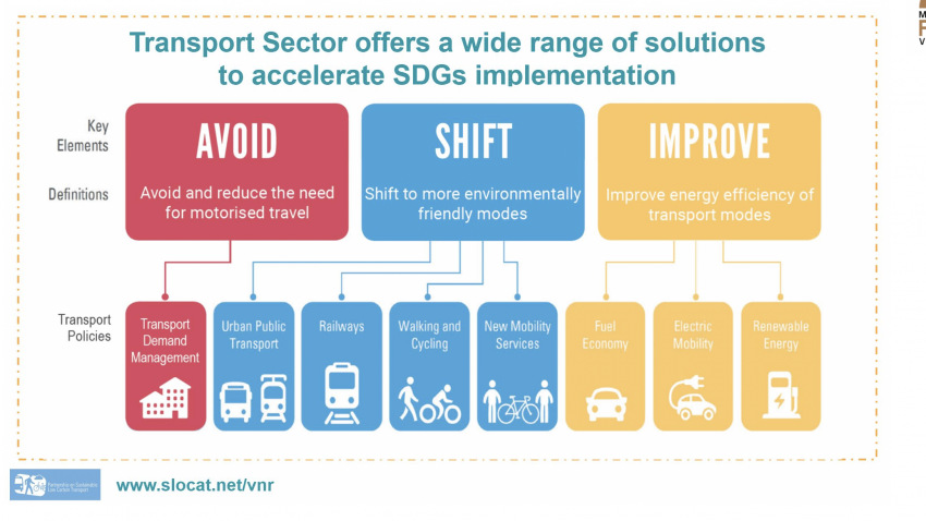 L’ONU définit trois leviers pour décarboner la mobilité : éviter les déplacements (avoid), transférer les déplacements carbonés vers d’autres modes (shift), améliorer la technologie (improve) pour augmenter l’efficacité des véhicules (carburants, moteurs, passage à l’électrique).